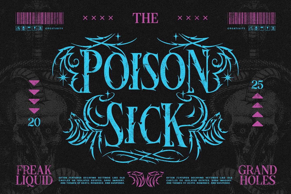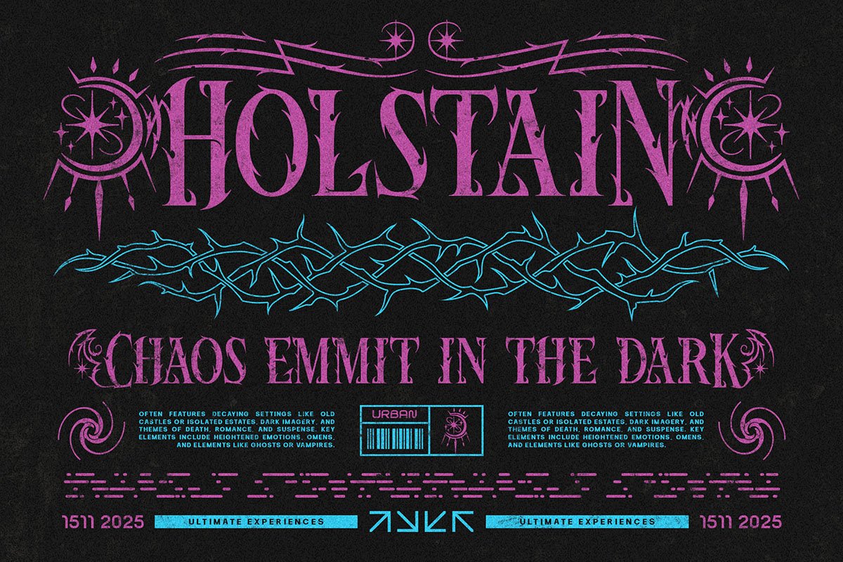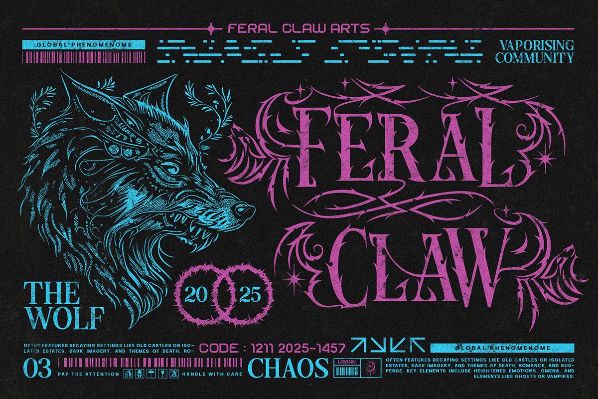 Inspired by the fantastical silhouettes of dragon scales and the feral sharpness of wolf fangs, it is not merely a font—it is a visual weapon. This “Neo-Gothic” Blackletter style features unique, flame-like edges and razor-sharp terminals that command attention immediately. It captures the essence of mystery, rebellion, and raw power.