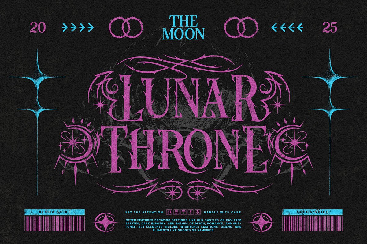 Here comes a Neo-Gothic Masterpiece Inspired by Myths and Darkness! Unleash the beast within your designs with Alpha Spike Font, a typeface that bridges the gap between ancient darkness and futuristic aggression.