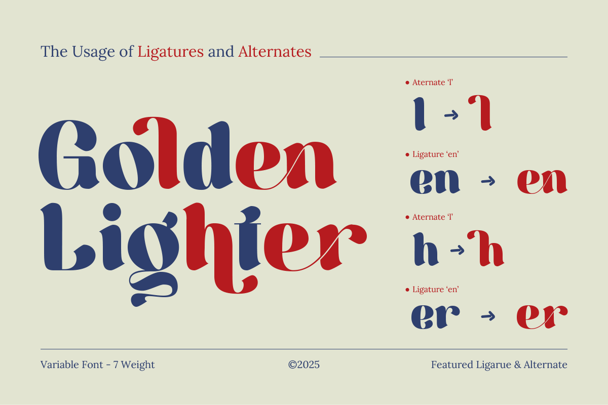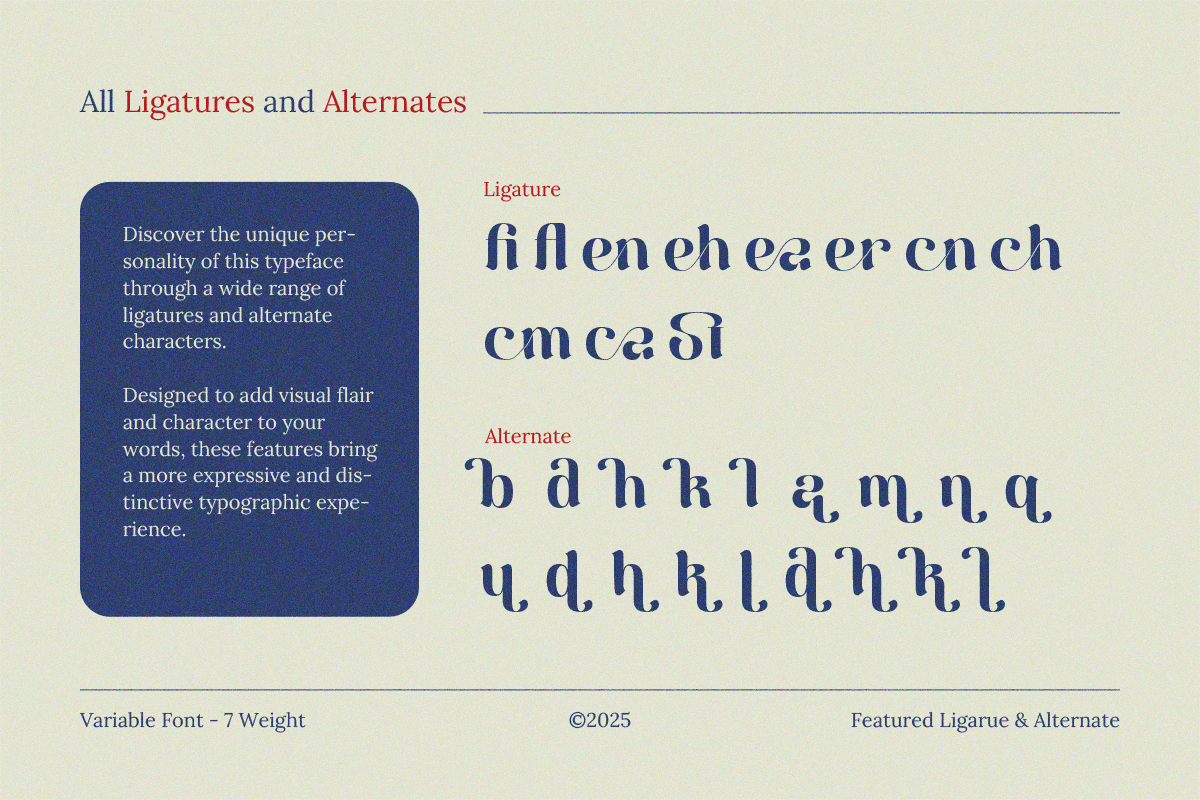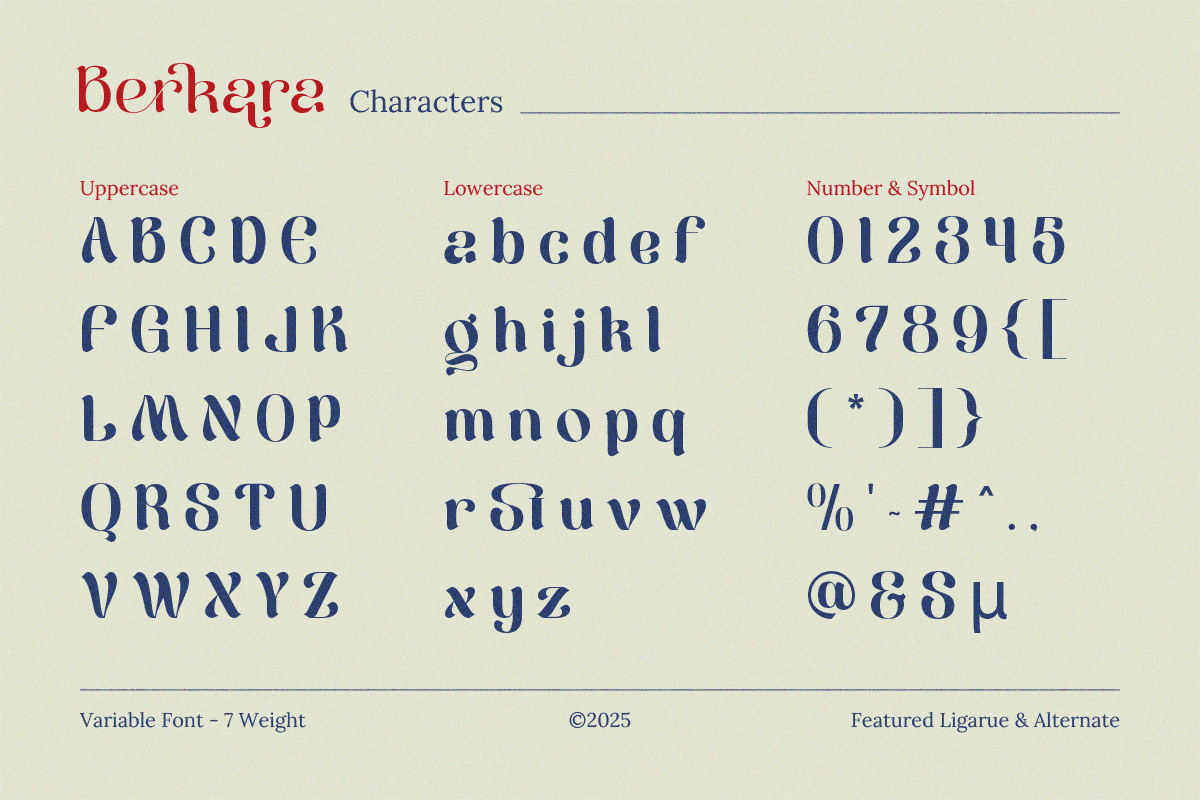 Berkara – Display Font is a vintage-inspired serif font family with a modern and elegant twist. With 7 versatile styles —Thin, Extra Light, Light, Regular, Medium, Semi Bold, and Bold— Berkara offers flexibility for a wide range of creative applications. Its refined ligatures and graceful curves make it perfect for stylish typography in luxury branding, fashion logos, editorial layouts, premium packaging, and sophisticated display design.