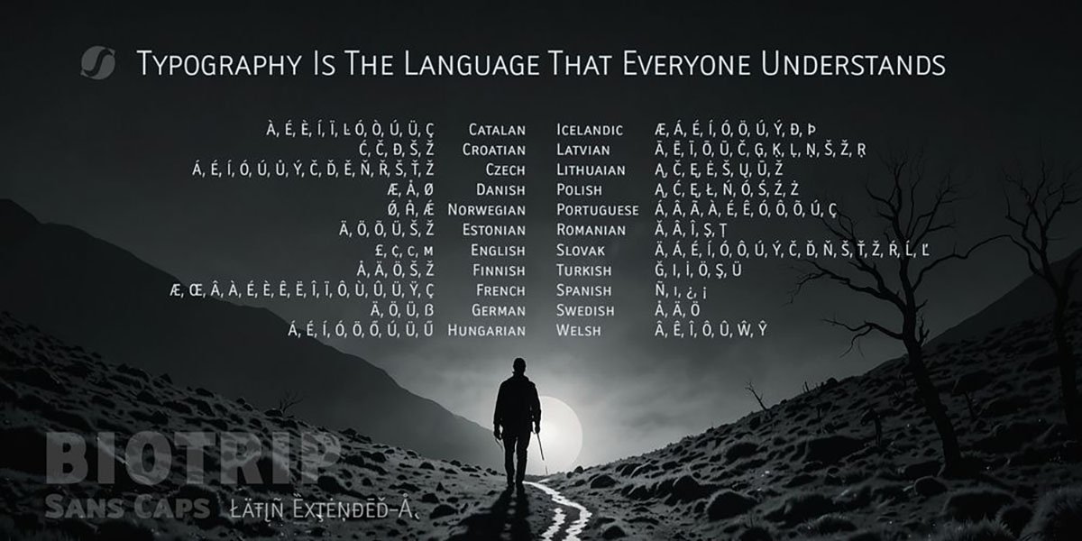 Biotrip Sans Caps is a multipurpose typeface, refined down to the last detail. It includes seven weights—Light, Regular, Medium, Semi Bold, Bold, Extra Bold, and Black—that allow for the creation of solid, adaptable, and expressive visual systems.