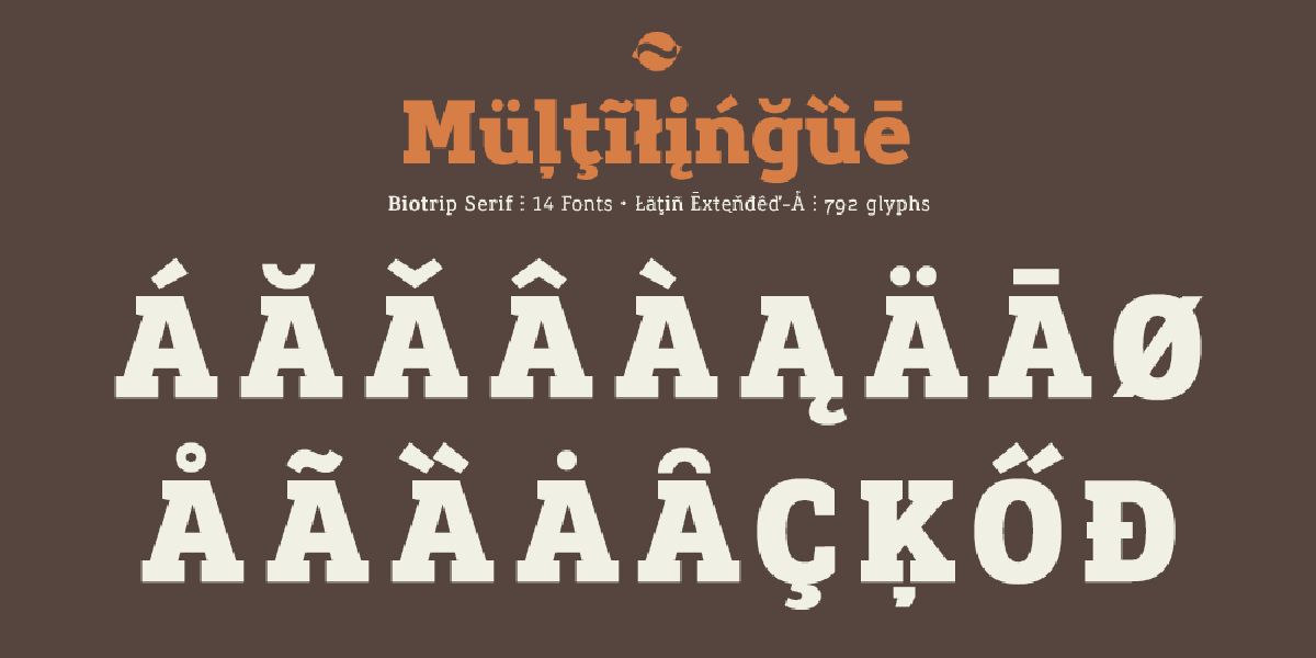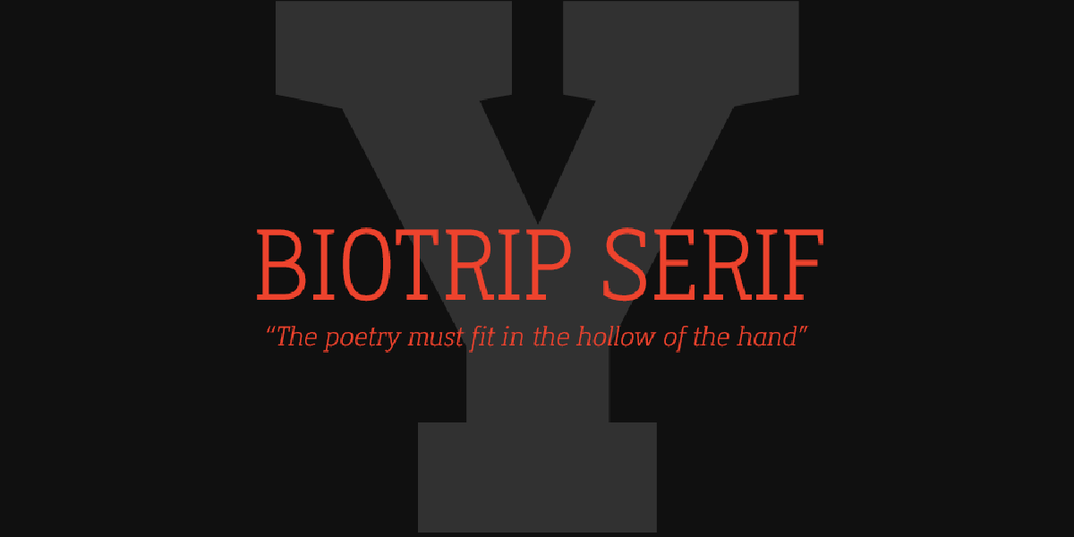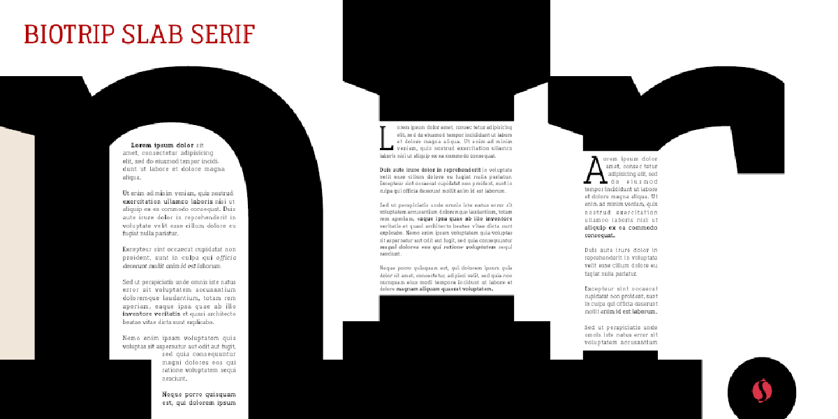Biotrip Slab Serif was born as a humanist slab serif. It is that particular kind of typeface that blends rational geometry with Egyptian boldness and the sensitivity of a hand-drawn stroke.