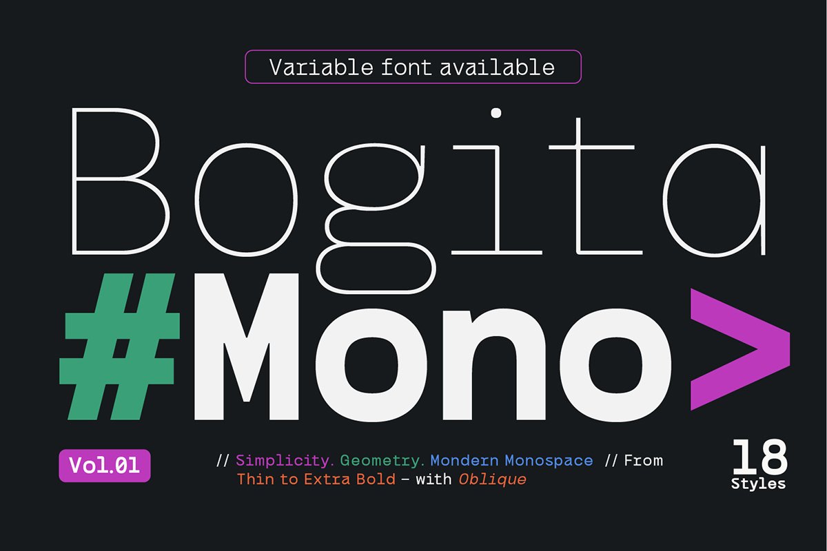 Bogita Mono – Sans Serif is a modern geometric monospace typeface designed with simplicity and precision in mind. It blends the clean structure of a coding font with a stylish contemporary aesthetic, making it perfect for digital interfaces, tech branding, and modern editorial layouts. The full version is available in 18 styles, from Thin to Extra Bold, including Oblique versions and a Variable font. This font provides full flexibility for both creative and technical design projects.