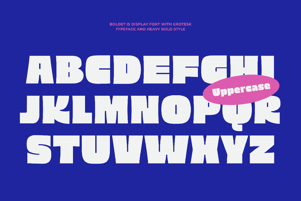 Boldet – Bold Font comes in a grotesk style that is bold, solid, and full of character, bringing out an expressive blend of retro and modern vibes. Its block shaped forms with subtle curves give it a funky, playful, and energetic feel, making it a perfect choice for titles, posters, or designs that require strong attention and a striking visual presence.