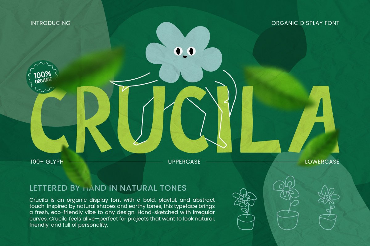 Crucila Display Font is a vibrant organic display font that blends boldness, playfulness, and a hint of abstract charm. Inspired by natural shapes and earthy tones, it infuses any design with a fresh, eco-friendly spirit. Its hand-sketched, irregular curves give it a lively, human touch, making each letter feel as if it’s growing right off the page. Perfect for projects seeking a natural, approachable, and personality-rich aesthetic, Crucila brings designs to life with warmth and authenticity.