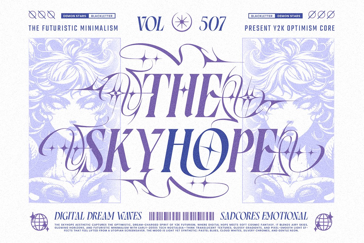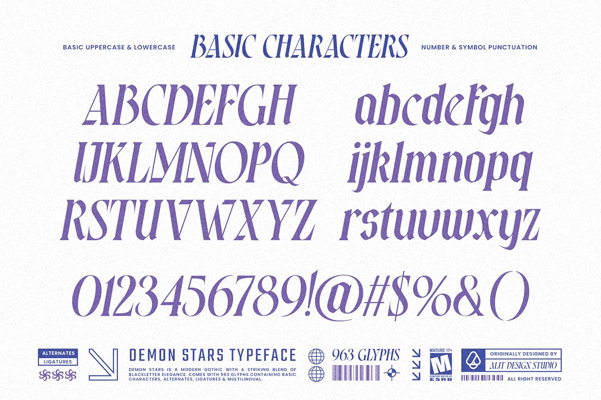 Demon Stars Typeface is a high-octane Italic Blackletter typeface that bridges the gap between ancient gothic tradition and the rebellious spirit of modern streetwear. Born from the intersection of “Gate of Babylon” engraving art and contemporary Y2K grunge, this font is designed to cut through the noise.