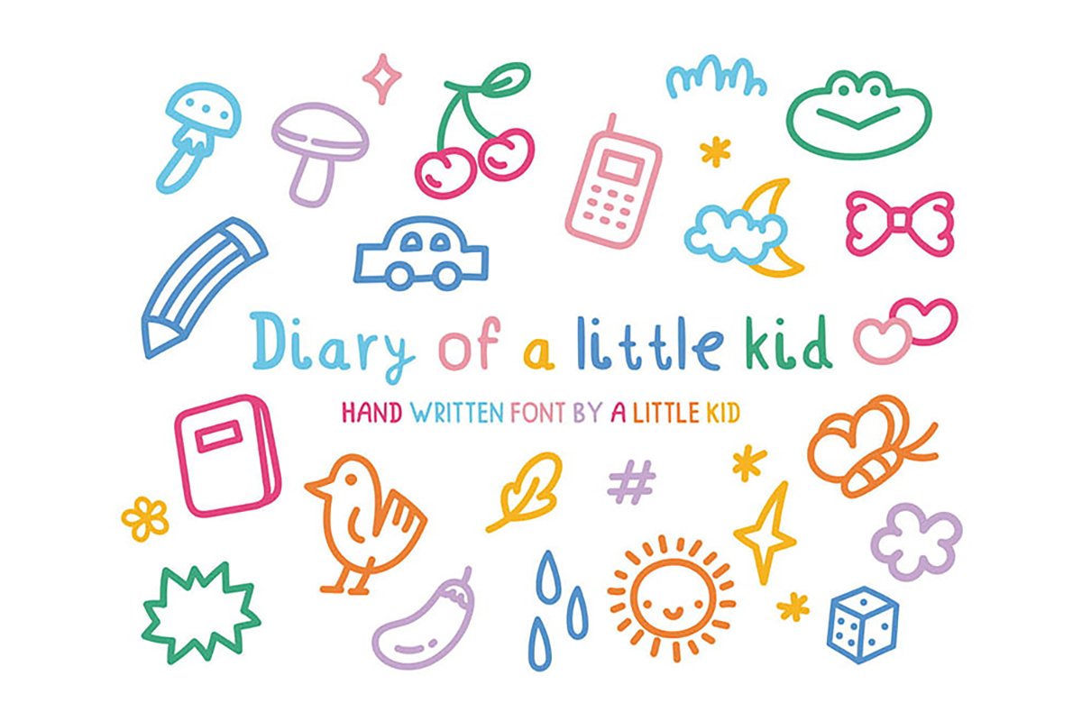 Beautiful handwritten font by little boy or a girl also work perfectly in activities beyond past schooling, including educational toys, storybooks, kid’s birthday invites, kid’s apps, kid-centric websites, and lapboards. Naturally, because this type of typeface is not designed for long text or serious documents, and used for Fun branding for family, child, or activity businesses, smart use of design to communicate child learning, and empathetically capture the audience. Diary of a little kid font has warmness and a playful sense of child learning. It especially supports creativity, confidence, and positive emotional connections during early education.