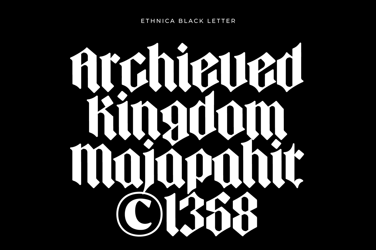 Ethnica – Blackletter Font is a font with unique form, crafted to deliver a strong historical presence with a contemporary twist. Its sharp angles, dramatic strokes, and distinctive letter structures create a bold personality that stands out in branding, packaging, posters, editorial headlines, and logo design.