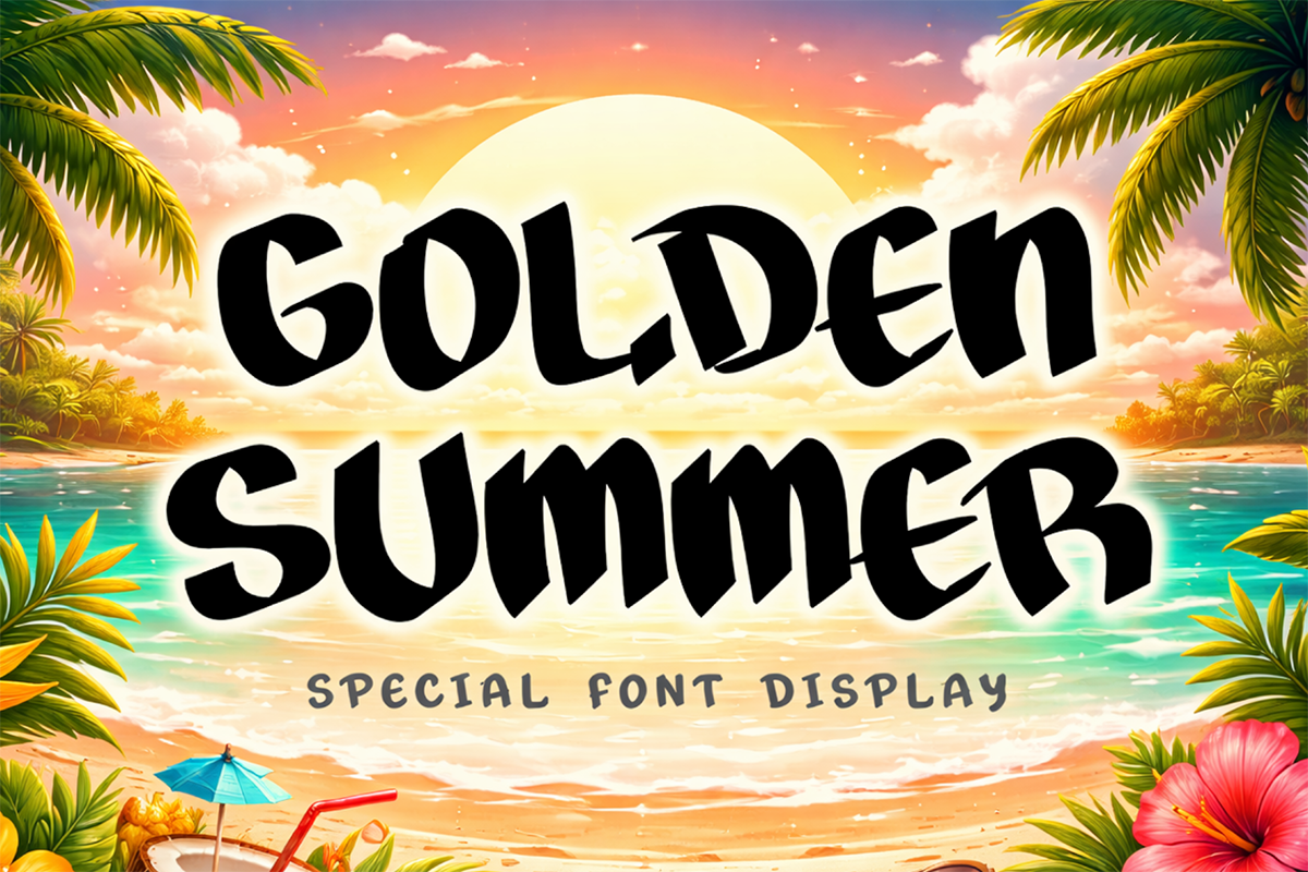 Golden Summer Font is a unique and elegant display font. It features uppercase and lowercase letters, numerals, punctuation, and multilingual support. It’s perfect for summer, holidays, spring, coloring books, logos, stickers, banners, branding, back-to-school, children’s magazines, prints, t-shirts, business branding, birthdays, and more.