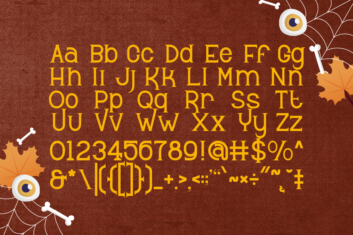 Hallow Fright – Display Font is a spooky and playful display font, perfect for all your Halloween-themed designs. With its quirky shapes and eerie vibe, this typeface instantly sets the mood for parties, posters, invitations, greeting cards, and festive packaging. Its bold personality makes it a fun choice for any project that needs a touch of frightful charm. It is designed to help you create ghostly headlines, haunted titles, and spooky messages with ease.