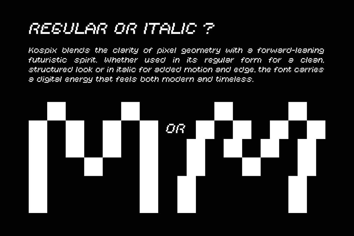 Kospix – Pixel Font is a clean pixel typeface, crafted with grid based square shapes that bring a classic retro digital feel. The italic option adds a slight dynamic slant that makes the pixel look more expressive without changing its signature character. Suitable for game UI, retro branding, interface text, and creative display designs, this font offers clarity, nostalgia, and versatility in one package.