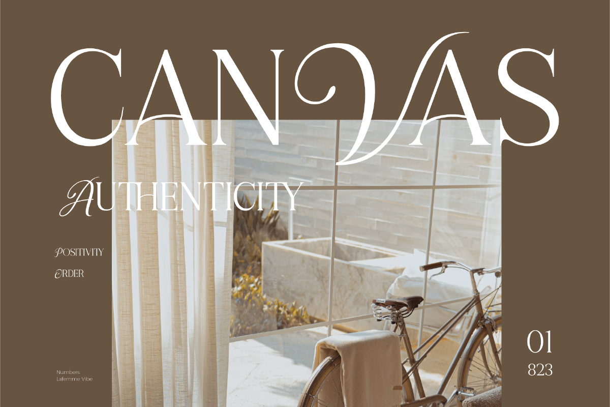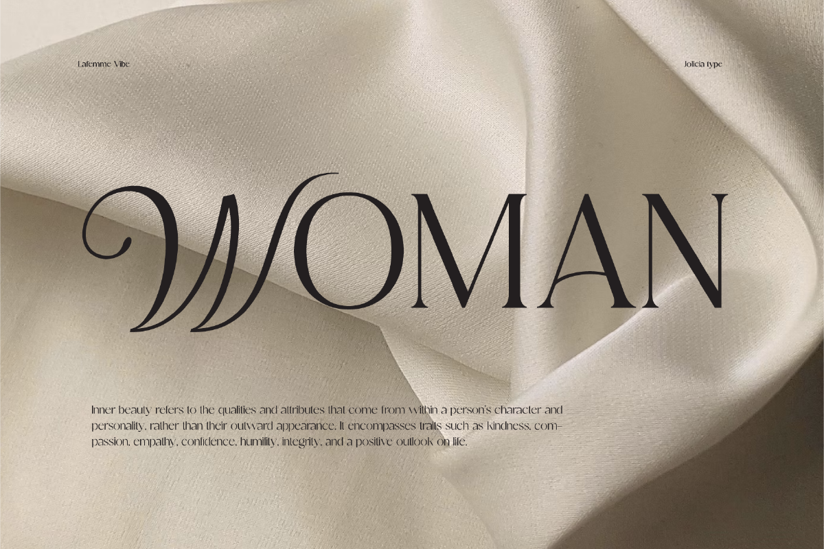 LaFemme Vibe – Serif Font is a conceptual font that exudes a modern and elegant aesthetic, tailored specifically for women. LaFemme Vibe is a typographic masterpiece created to bring a modern and elegant sensibility to women who appreciate beauty in every detail. It’s a font that effortlessly blends classic charm with contemporary allure, making it an ideal choice for a wide range of design projects aimed at celebrating the essence of femininity.