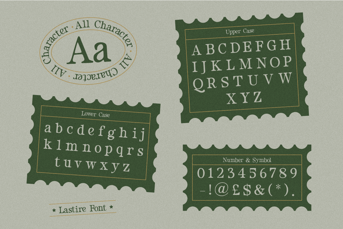 Lastire – Serif Font is a classic serif font that combines elegant typography with bold lettering and vintage aesthetics. Perfect for timeless designs, it adds a sophisticated and unique touch to branding, editorial layouts, posters, and packaging. Its high-contrast serifs and vintage stamp effects make it ideal for projects that demand a blend of retro charm and modern refinement.