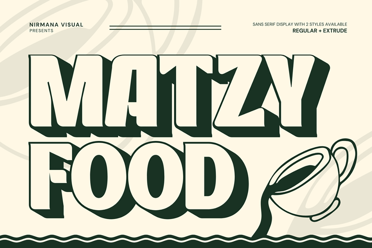 Matzy Food Font is a bold and flavorful display font crafted for standout culinary branding. Designed with strong extrude details, it delivers a dimensional, eye-catching look perfect for restaurant logos, food packaging, street food posters, menu boards, and promotional campaigns. Matzy Food blends playful curves with confident strokes, creating a tasty visual identity that feels modern, energetic, and irresistibly delicious. Perfect for brands that want to look fresh, bold, and unforgettable.