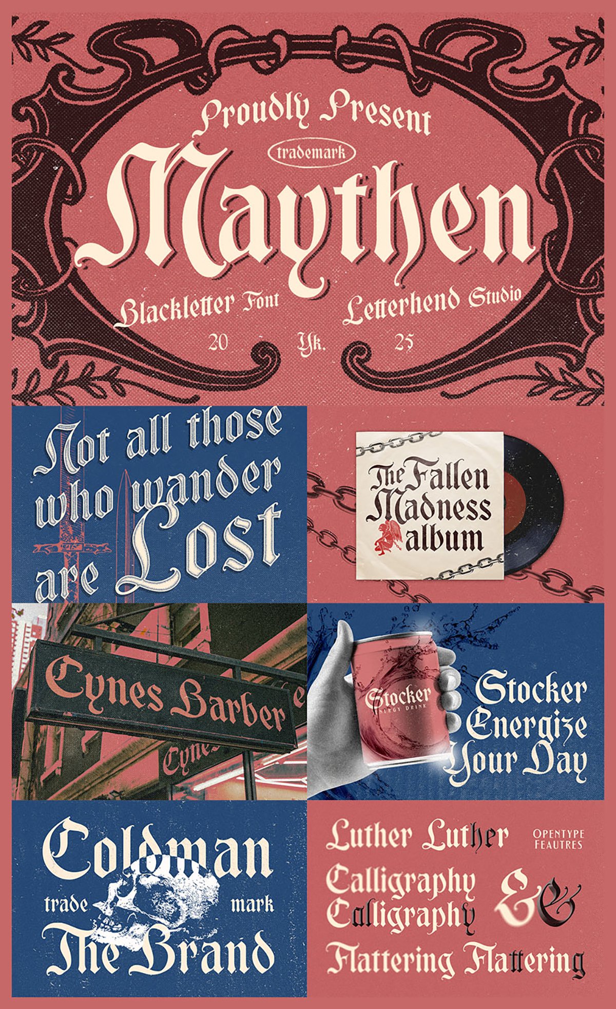 Maythen Blackletter Font is a majestic font crafted for those who dare to design with grandeur. Each stroke is steeped in old-world charm, echoing the elegance of medieval manuscripts and vintage posters. With its bold curves and commanding presence, Maythen elevates everything from book covers to branding into something timeless and regal. Let your words speak with nobility, mystery, and dramatic flair — perfect for gothic themes, antique packaging, and storytelling design.