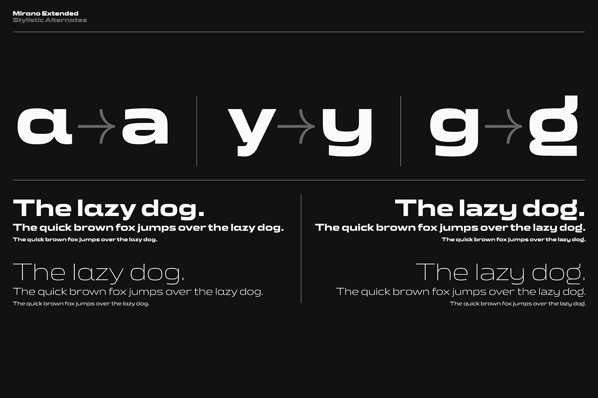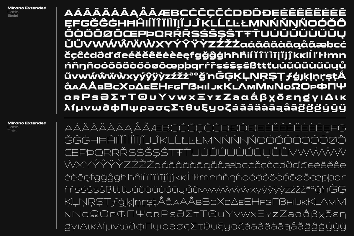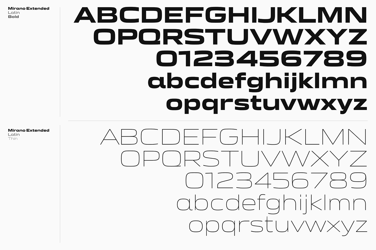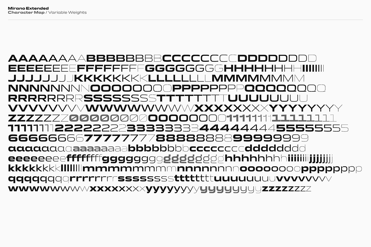 Built on a deep study of Aldo Novarese’s Eurostile, Mirano extends the concept further—reimagining its geometric, engineered logic with a more expansive stance, sharper rhythm, and a cleaner contemporary finish. The result is a family that feels mechanical yet premium: confident in headlines, stable in any design system.