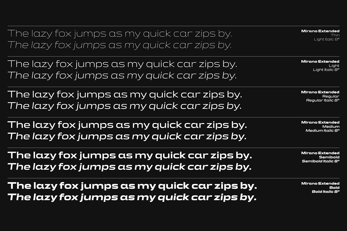 Mirano plays across a variable weight axis, ranging from Thin to Bold, and is also released as 6 static weights for maximum compatibility. Each weight is paired with a matching italic, engineered to keep the same forward momentum and compact efficiency of the roman while adding speed and attitude.