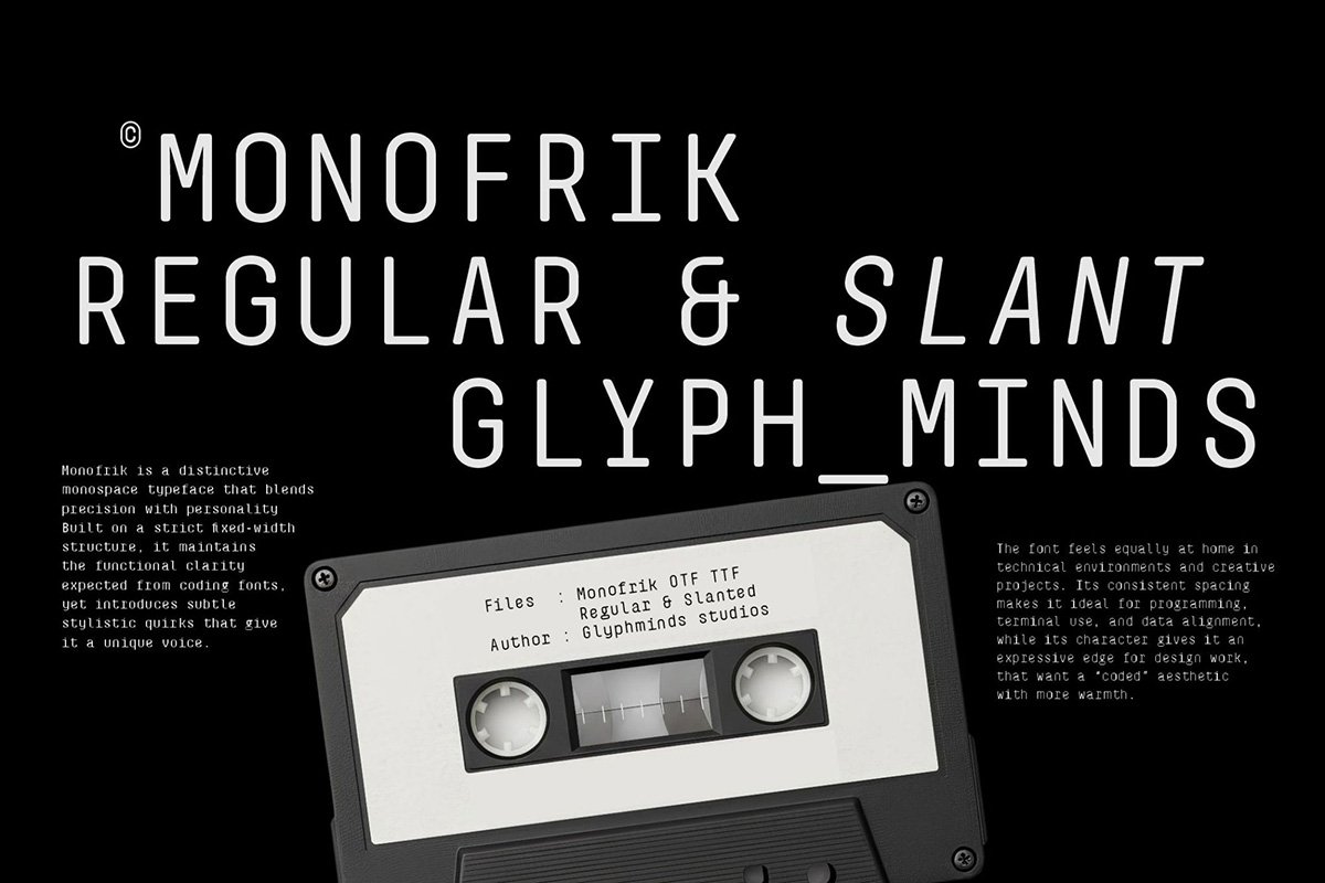 Monofrik Font is a modern monospaced typeface designed for creators who want clean structure with a unique twist. Built with precision and simplicity, it blends a technical coding style with smooth rounded details—making it perfect for branding, UI design, posters, tech projects, and editorial layouts. Whether you’re designing for a startup, building a developer portfolio, or crafting minimalist visuals, Monofrik delivers a professional and contemporary look that stands out without being overwhelming.