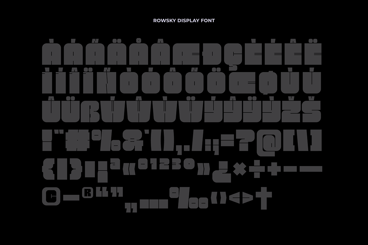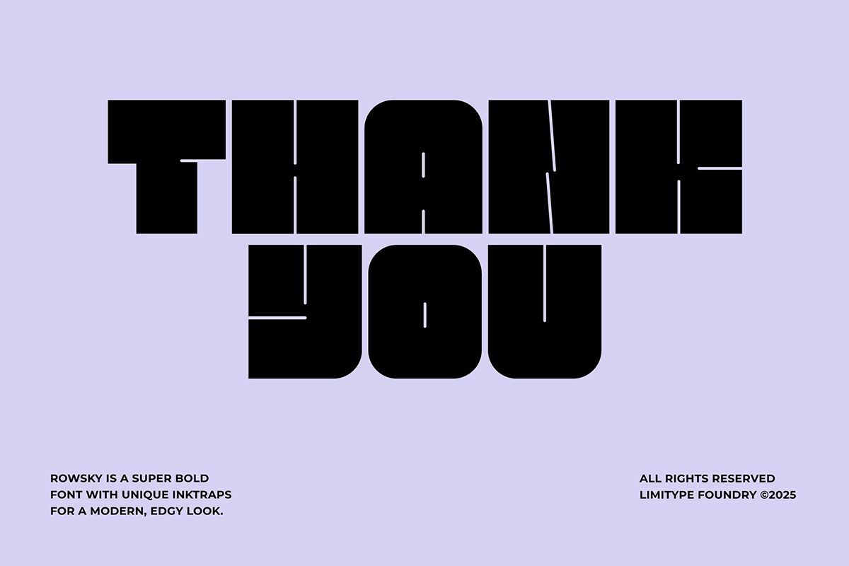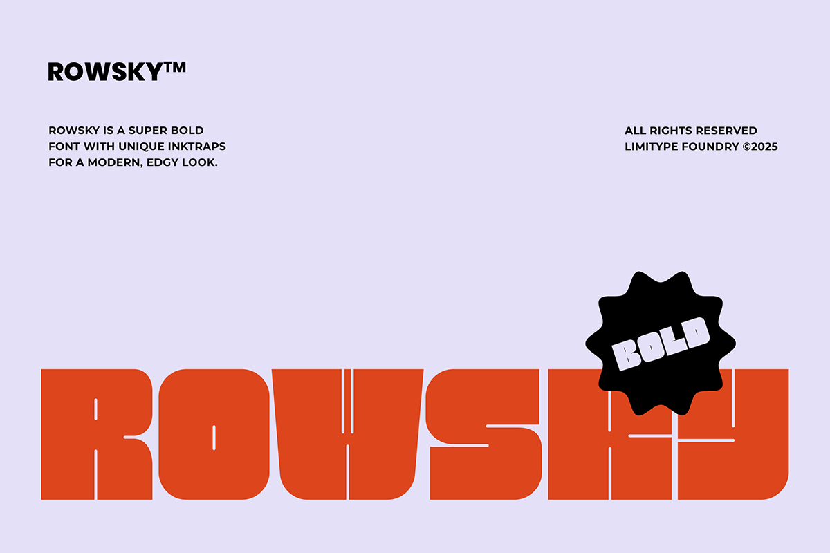 Rowsky – Bold Fold is a super bold font with sturdy, blocky shapes full of character. Its unique style details bring a modern, edgy feel that sets it apart from typical bold fonts. Perfect for headlines, posters, logos, and visual identities that aim to appear strong, confident, and memorable.