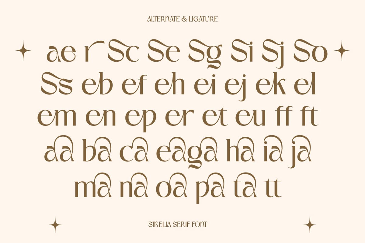 Sirelia works beautifully across fashion editorials, lifestyle magazines, interior branding, beauty products, and premium packaging. Its distinctive alternates and ligatures add a stylish, artistic touch, allowing designers to create expressive and memorable typographic compositions without losing readability.