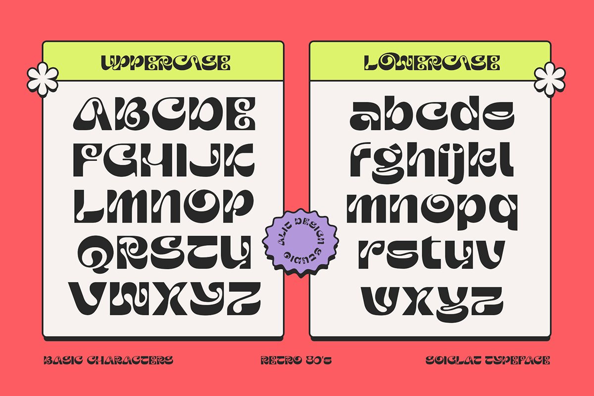 Soiglat Display Font is here! Step into a time machine tailored for the modern designer. Soiglat is a funky, liquid-style display font that perfectly captures the playful spirit of the Retro 80s and 90s, blended with a fresh, psychedelic twist.