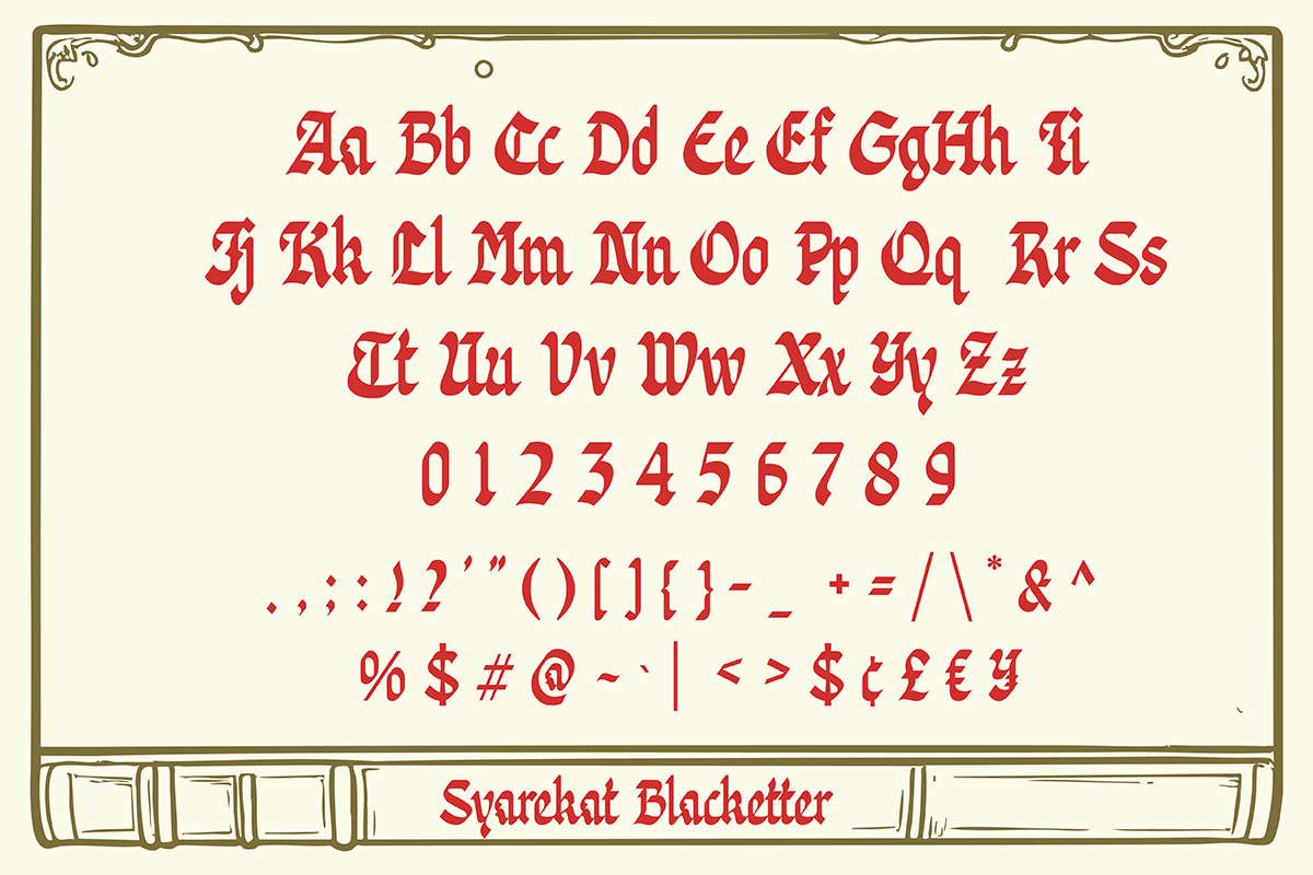 Thanks to Bonjie for sharing with us this exquisite font! However, this Syarekat Blackletter Font is only a demo version available for personal use. So, if you want to access more its full features and license, go get the premium version as well!