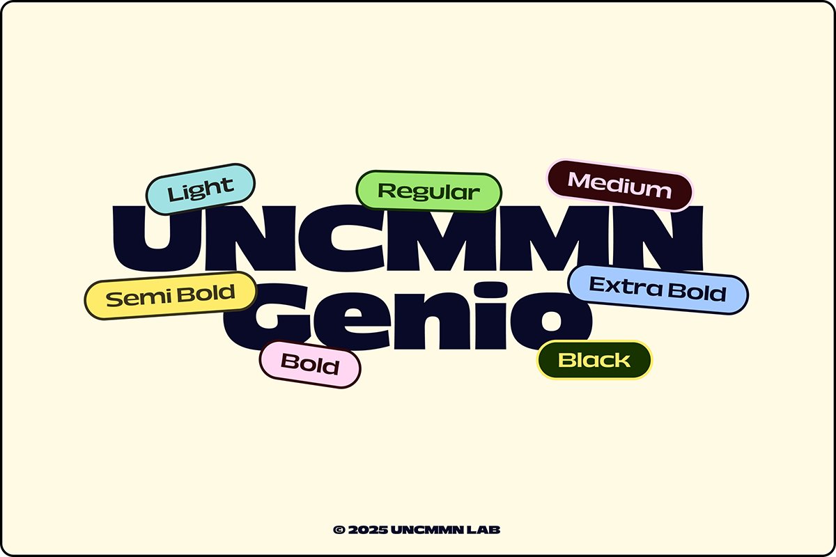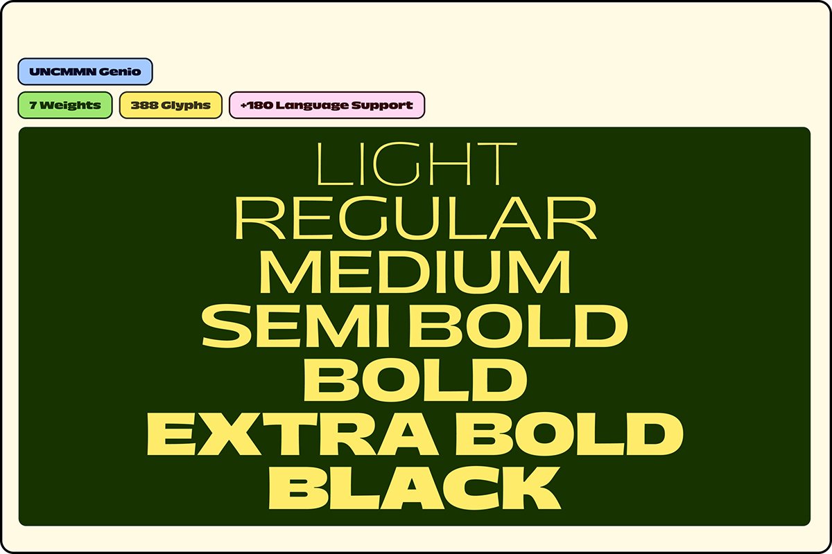 The type family offers a wide range of weights, from Light to Black, which enhances its versatility. Lighter cuts communicate elegance and refinement, while heavier styles create a bold, confident presence suitable for headlines or impactful brand statements. The consistent geometry across all weights ensures harmony within compositions, while the proportional spacing and clear forms make reading effortless. With its combination of functional clarity and subtle personality, UNCMMN Genio positions itself as a strong choice for projects that demand both professionalism and visual distinction.